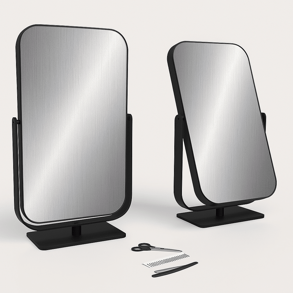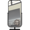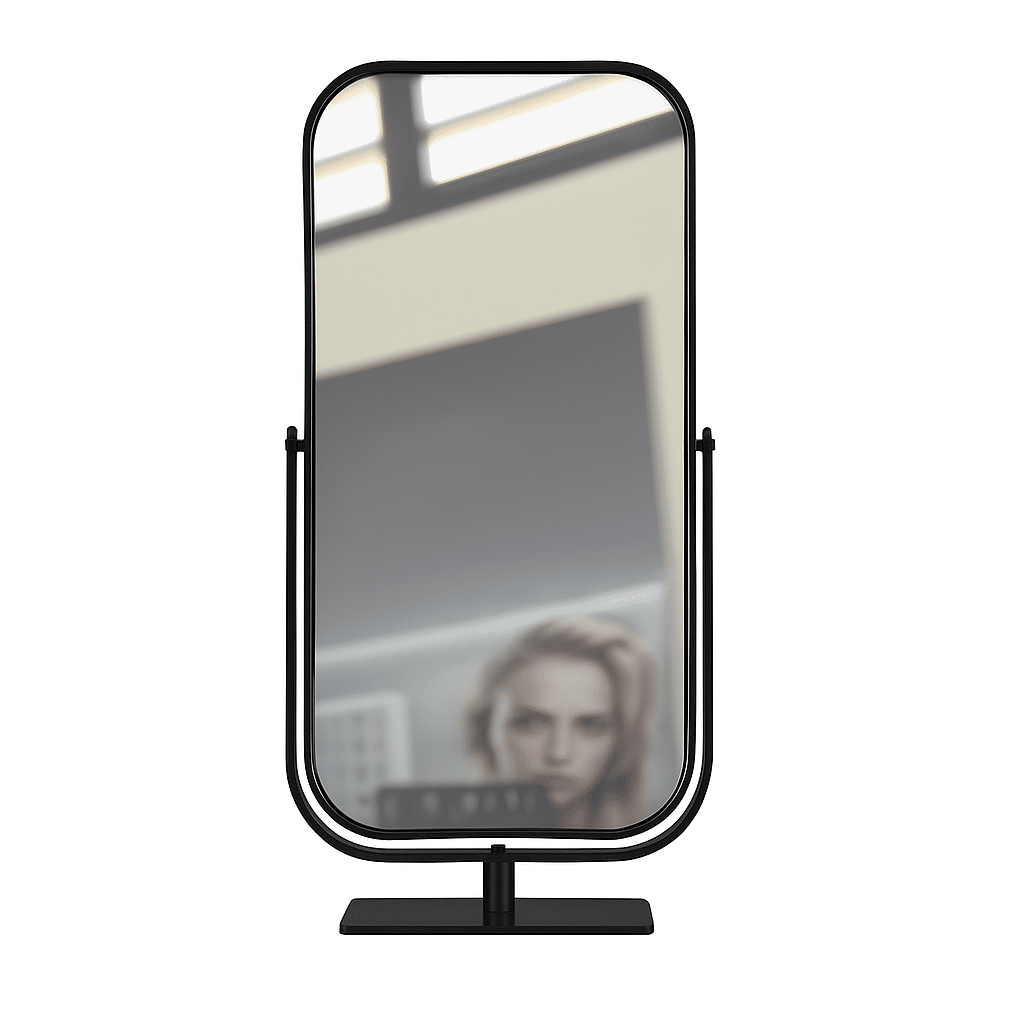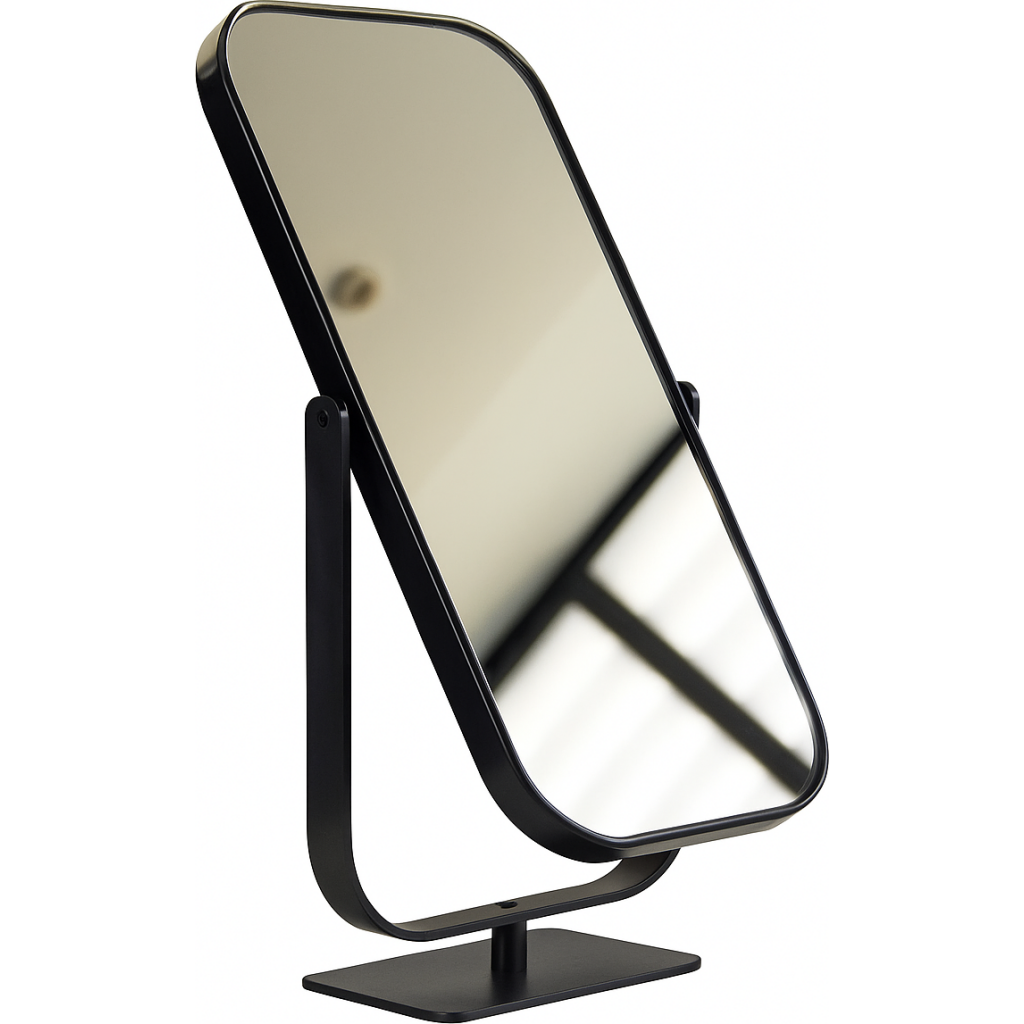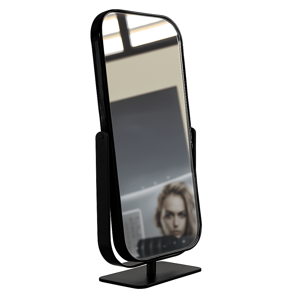 Our item Spech is chic, minimalistic and functional. It is a one-sided table mirror that can be tilted. An item that cannot be missed in your salon. It can also be combined with any style because it has a timeless design and is available in glossy black or glossy gold.