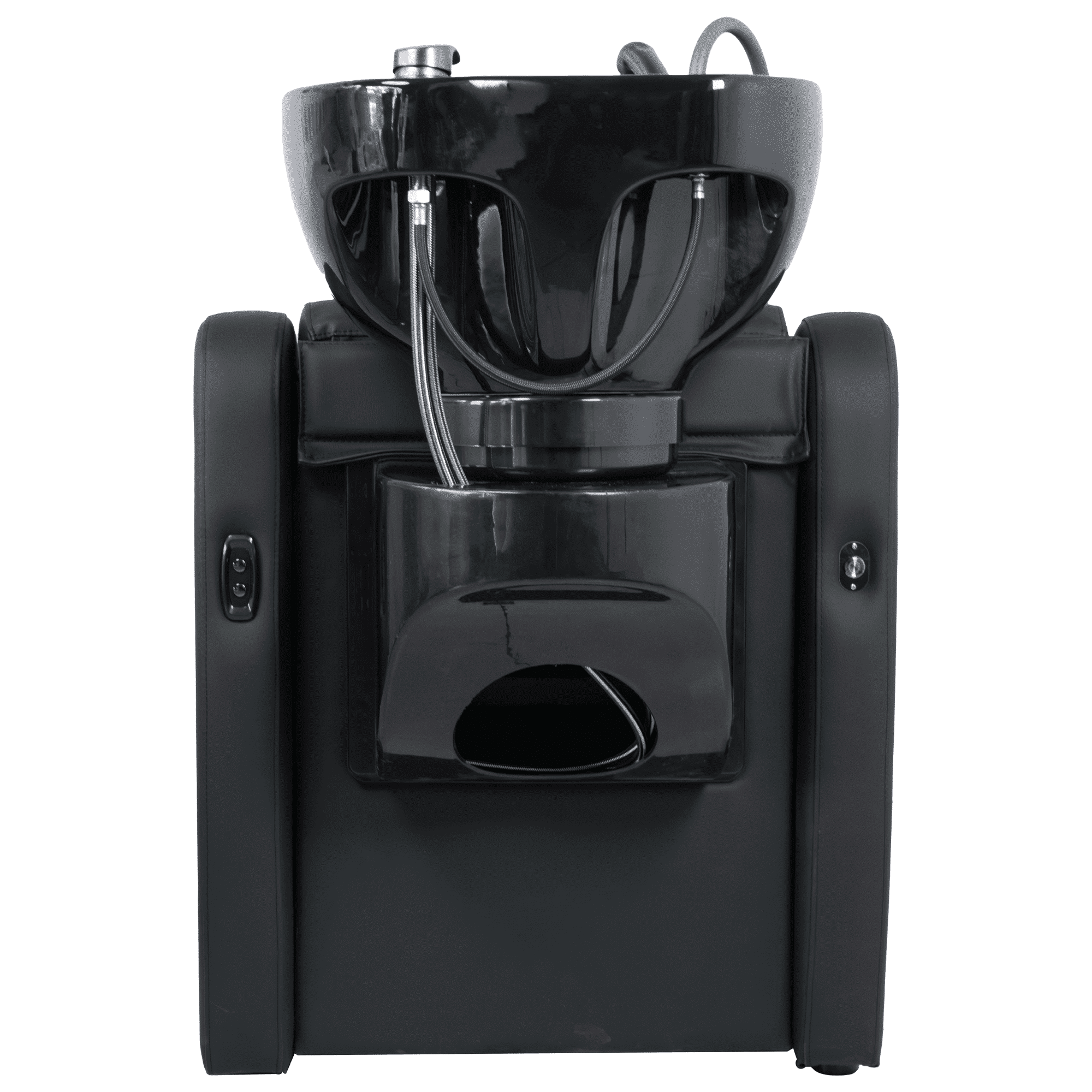 Shampoo-stoel met een elektrisch verstelbare voetensteun uit één stuk, ideaal voor het comfort van de cliënt tijdens langere behandelingen. Gebouwd met een intern metalen frame. De zitting en rugleuning zijn voorzien van veren voor extra comfort, en de rugleuning heeft extra vulling in de lendensteun. Diepe keramische wasbak in wit of zwart, verstelbaar met een kantelmechanisme. Hoogwaardige eengreepskraan met roestvrijstalen leidingen. Chromen douchekop met polyamide slang. Roestvrijstalen afvoer. Gereedschapsvrije, verwijderbare rugleuning voor eenvoudige installatie. Hoogwaardige zwarte bekleding.